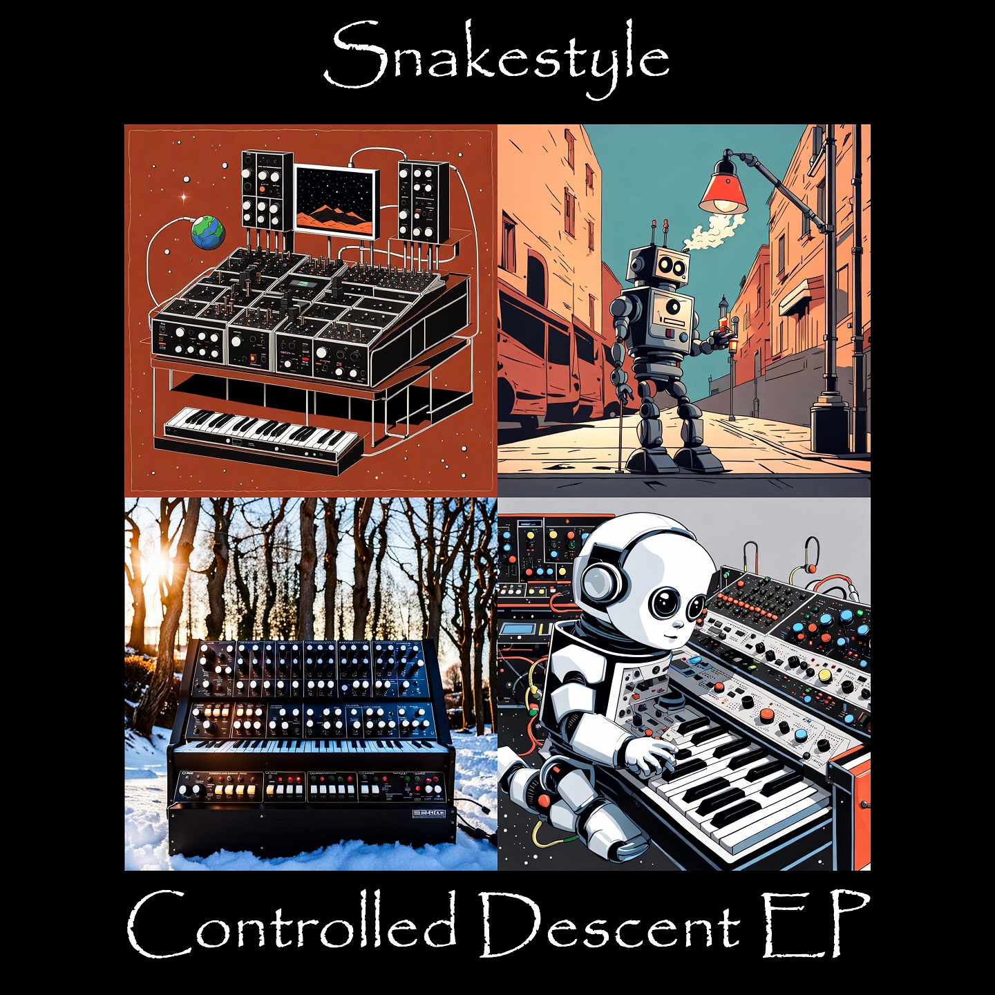 The Controlled Descent EP is the latest offering from Snakestyle (a.k.a. Matthew Leigh Embleton) featuring 4 tracks of finely-crafted electronica, the result of initial recordings made at the synth room at Silver Shark Studios in London. Trademark crunchy analogue beats, deep warm bass, and shimmering atmospherics fused with digital and analogue modular synthesis bring to life retro-futuristic imagery and visions of an artificially intelligent future. The title track 'Controlled Descent' contemplates an ever increasing role for artificial intelligence in the field of space exploration with an imagined successful automated touchdown on the surface of Mars with ever decreasing human supervision. The second track 'And That Is Why' explores the concept of logic and machine learning, with the sounds of specially designed machines whirring to life to observe the many patterns that exist in human behaviour and interaction. The third track 'Low Winter Sun' describes the human solitude and isolation that exists in remote areas of extreme cold, and how it affects human relationships with nature in moments of contemplation. The last track 'The Muse' is a description of a sudden rush of creative energy following the inspiration that can arise from a single sound.