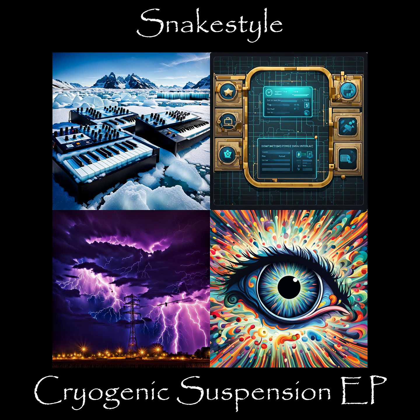 The Cryogenic Suspension EP is the new EP from Snakestyle (a.k.a. Matthew Leigh Embleton) with 4 tracks of spaced out electronic grooves, partly recorded at Silver Shark Studios in London. Snakestyle's analogue infused synth textures and atmospheric sounds roll out over irrisistable rhythms and bring to life images of fusions between ever advancing technology and human beings. The title track 'Cryogenic Suspension' burbles and whirrs to life introducing a chilled-out beat, layered with punctuated melodic phrases and fuzzy fusions of analogue and digital sound, suggesting cold temperatures and scientific processes to the ears and the mind's eye. The next track 'Downtime Interface' begins with the sound of a strange mechanical device that announces the arrival of sequenced analogue percussion, cross-rhythm ostinatos, and laid back riffed melody, the rhythm intensifies and locks in the listener for the journey through glistening synthesis. 'Electrical Storm' follows with haunting chords that suggest that something is in the air, a storm is coming. The rhythm and melody hold the listener's concentration and provide steady and reassuring progress through this atmospheric turbulence, navigating through the storm. The call and response between the turbulence of the sky and the melodic internal dialogue of the listener give way to a relaxed state. 'Hallucination' is a sonic imagining of radio interference signalling the arrival of magical energies, and the opening of a door in the mind, releasing memories from the subconscious into the present.